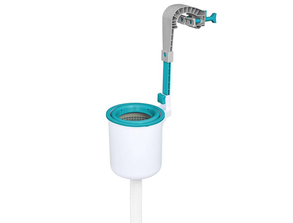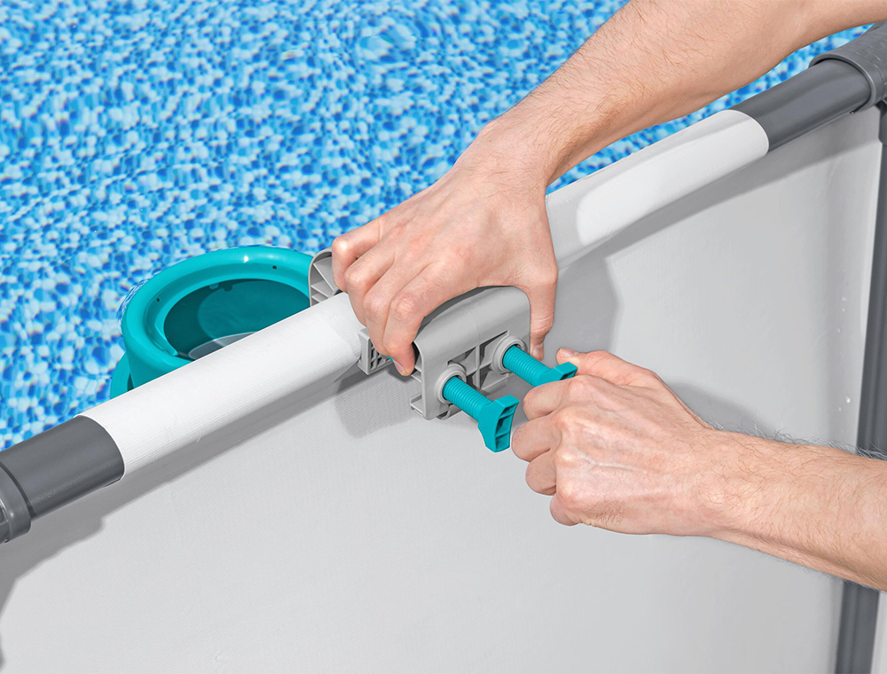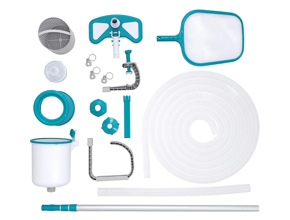 Для сбора осадка и мусора со дна бассейна, нужно подключить набор по следующей схеме: гофрированный шланг одним концом присоединяется к отверстию в стенке бассейна, через которое поступает вода в фильтрующий насос, а к другому концу крепится одна из насадок для очистки дна бассейна. При включении насоса медленно передвигайте щетку по дну. Мусор вместе с водой будет проходить через колбу-фильтр (частично крупный мусор останется здесь) и поступать в скиммер и далее в насос, где и останется, а чистая вода поступит обратно в бассейн.