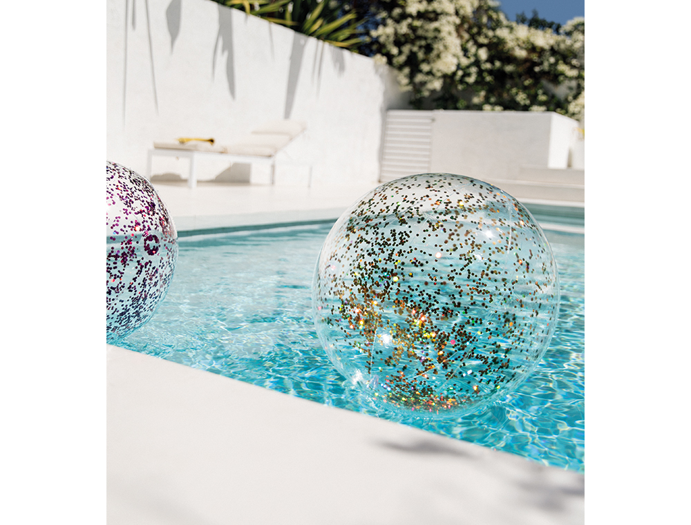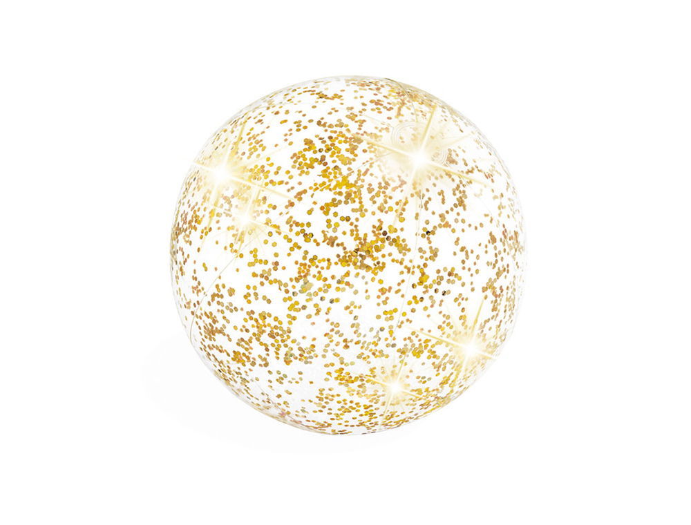 Этот пляжный мяч диаметром 71 см наполнен золотыми или розовыми блёстками, которые перемещаются внутри мяча. Солнечные лучи отражаются от блёсток и переливаются всеми цветами радуги.