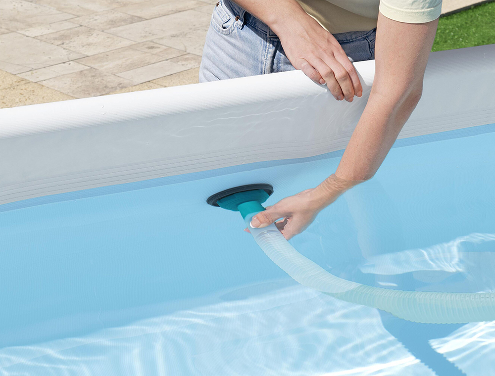 Для сбора осадка и мусора со дна бассейна, нужно подключить набор по следующей схеме: гофрированный шланг одним концом присоединяется к отверстию в стенке бассейна, через которое поступает вода в фильтрующий насос, а к другому концу крепится одна из насадок для очистки дна бассейна. При включении насоса медленно передвигайте щетку по дну. Мусор вместе с водой будет проходить через колбу-фильтр (частично крупный мусор останется здесь) и поступать в насос, где и останется, а чистая вода поступит обратно в бассейн.